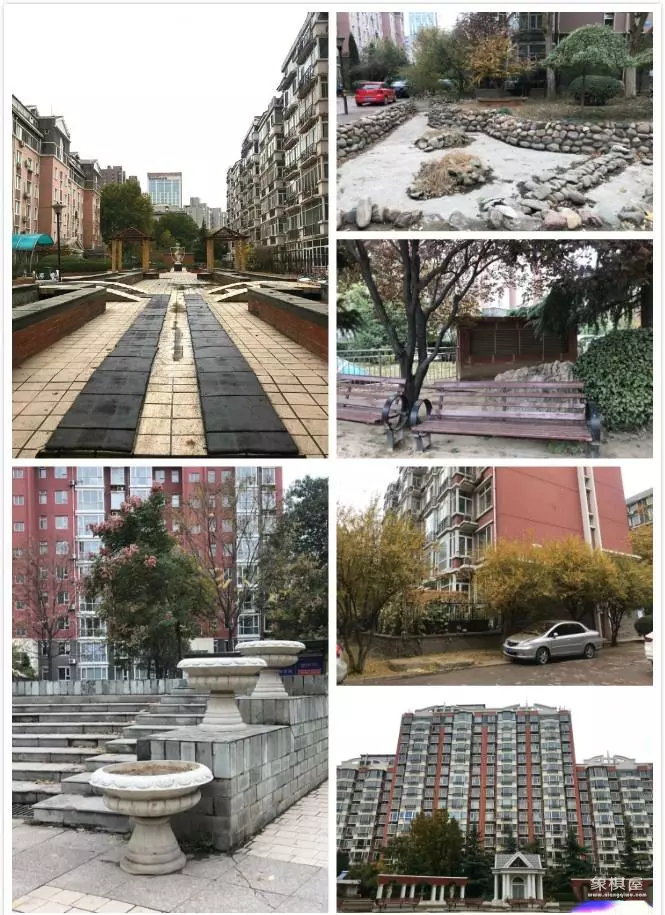 小组在雨后来到这里,小区内的景观呈现一片萧瑟之相。由于天气原因,小区内有很多落叶,但也不难看出,春夏季节的博雅庄园是一个绿化比较高,环境静谧优美的小区。小区广场上的雕塑和亭子与小区的建筑风格相得益彰,都是新古典主义的欧式风格。小区内的其他水系已经停运,而广场上面积不大的人工湖还在运行。