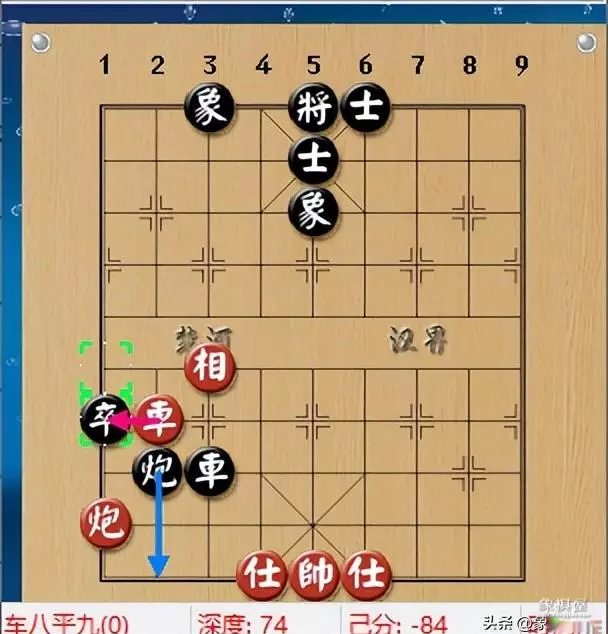 黑方开始也无好法,直打入车炮单缺相对车炮卒士象全,红车拉住黑车炮,黑卒1进1,弃卒,下出胜负手。