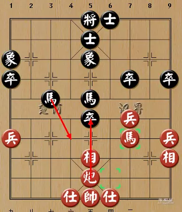 黑卧马杀进来,将红棋老帅打上二楼,又出肋道,红方老帅位危,局面相当难办,黑棋再出一马,同以一炮,车双炮马四子进击,红方形势千钧一发。