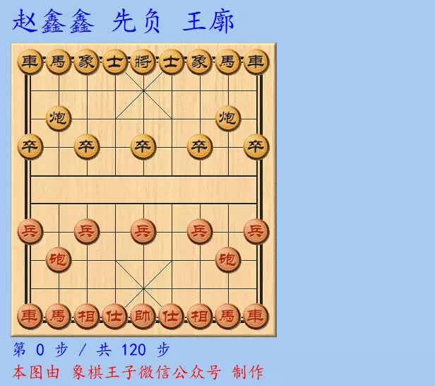 红方岌岌可危,赵鑫鑫未得调和之法,激斗下来,一车已被黑方车马卒三子生生困死,只能以车换马,这样的交换,红棋丢车必败,此后红方一直大亏上千分,王廓不慌不忙,且战且进,至120手,双车炮卒士象全对车马炮仕相全一举拿下。