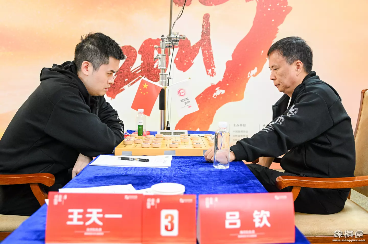 王吕之战,正值巅峰,32岁的王天一执红棋起手仙人指路,59岁的不老战神吕钦对挺卒,布局双方互进左马,在各自内线运子,形成隔空的对峙之态。