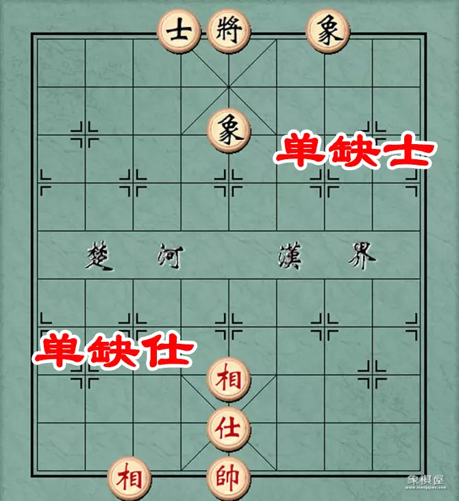 对局过程中,出现只有双士(仕)而缺一象相)的情况,叫单缺象(相)。