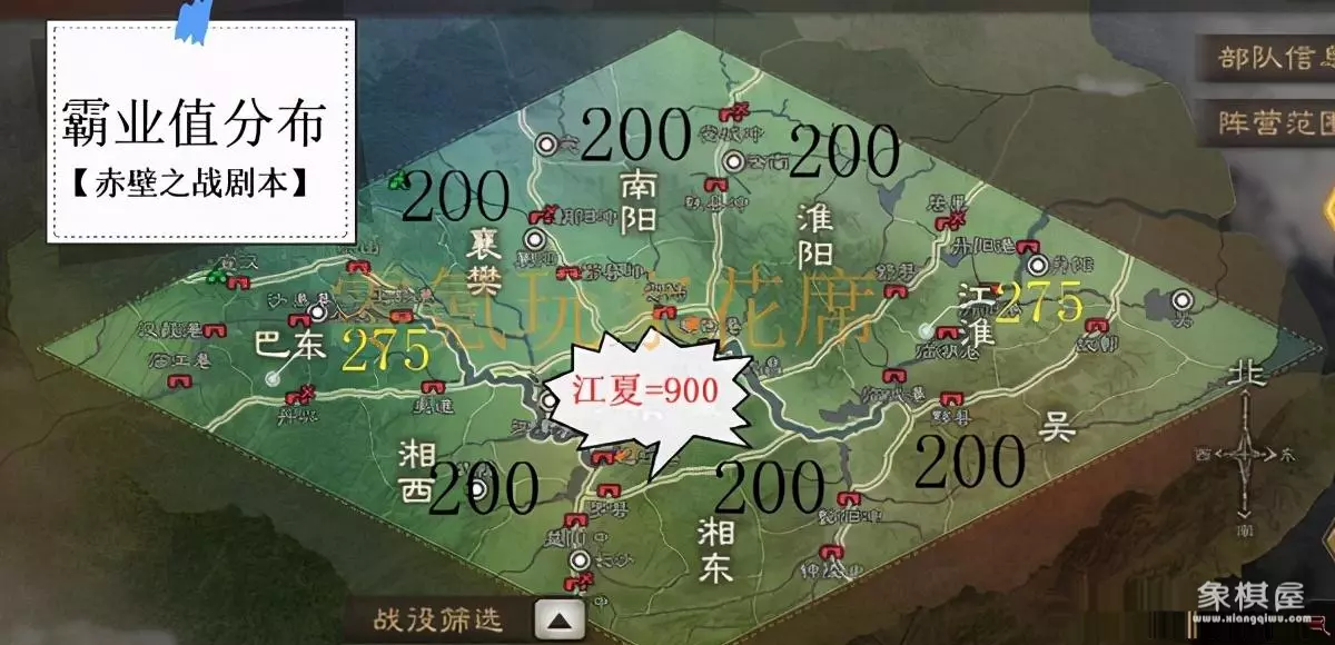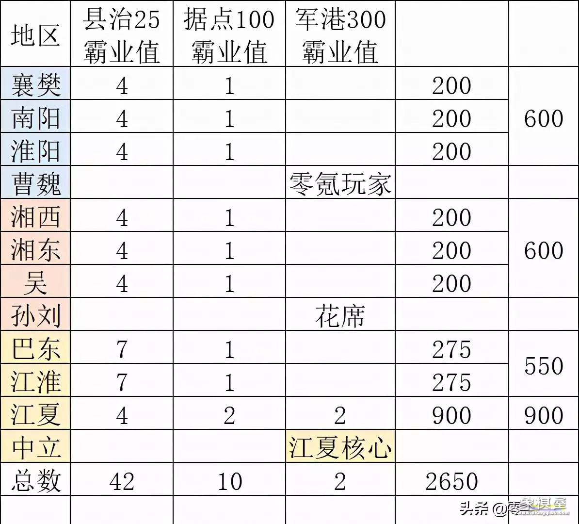 根据势力分布图,曹魏和孙刘各有600霸业值,两侧资源州各275霸业值,总计550霸业值,而江夏独占900霸业值。
