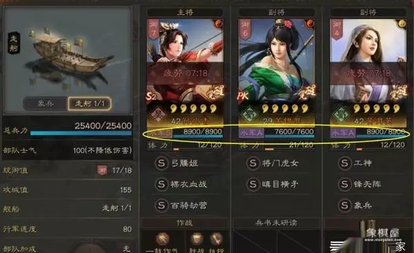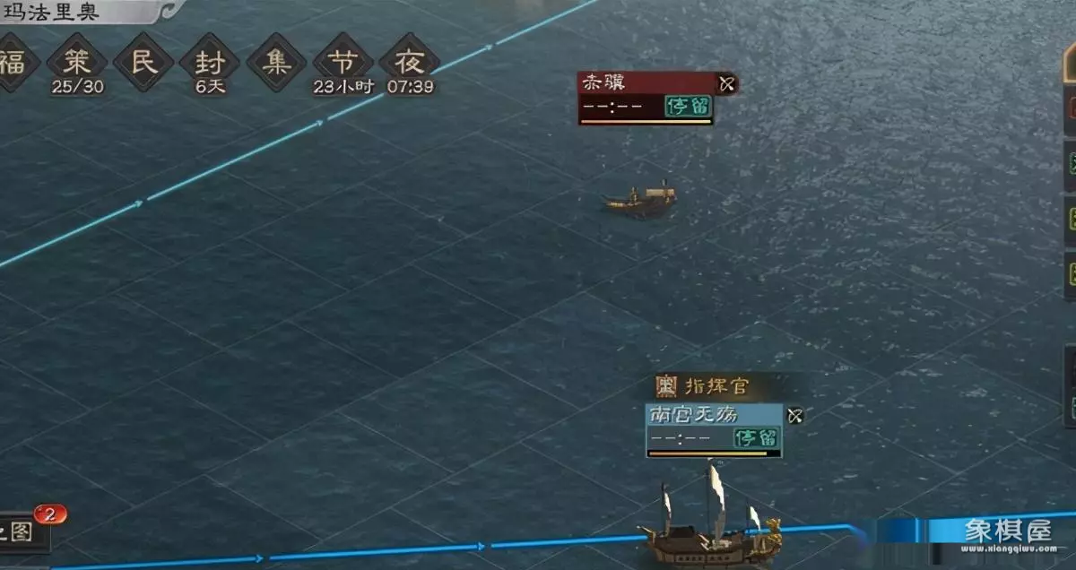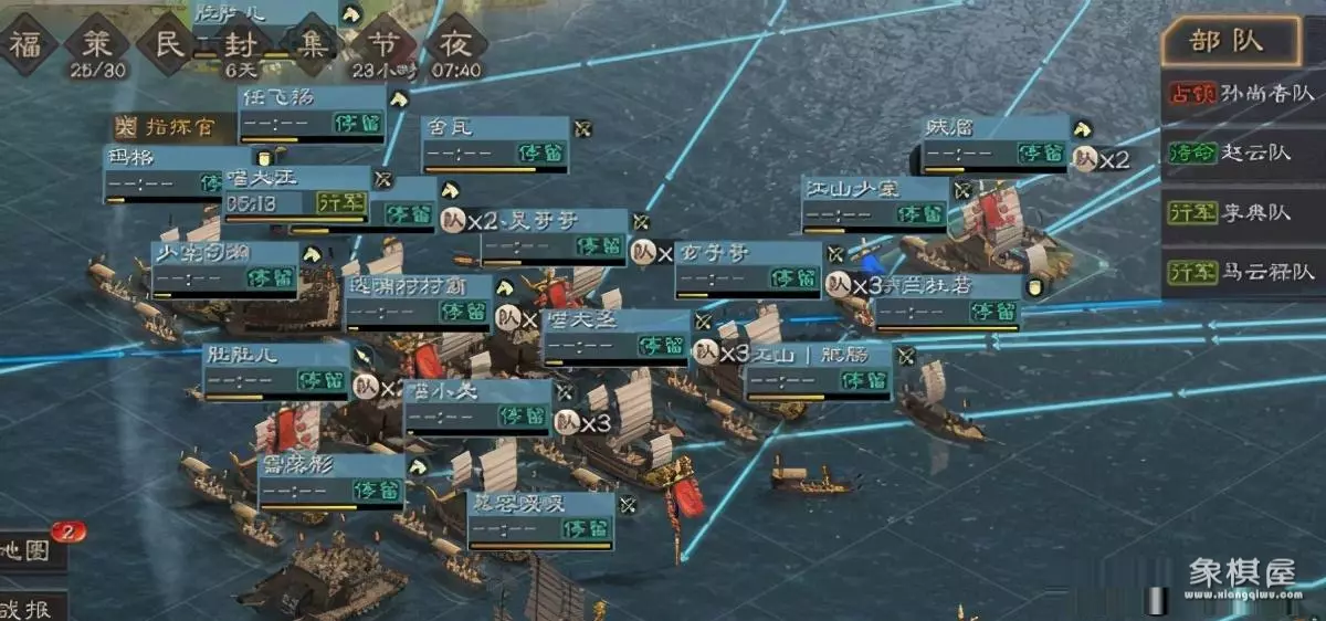 水面没有营帐的存在,士气消耗极大,只有锚地和旗舰附近可以快速恢复士气,所以水面行军切记不要“浪”,每次行军不要让自己低于60士气,不然被敌人埋伏就惨了。