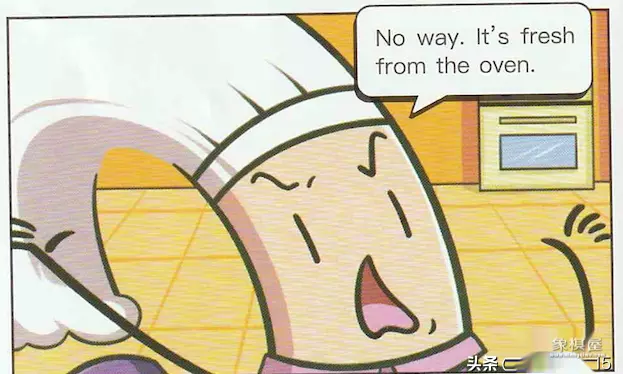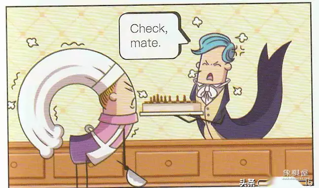 我们来看前两幅是一个烘焙师给穿着燕尾服的餐厅服务员递过去一个蛋糕,而且这个蛋糕还是国际象棋的样子。第三幅中服务员说:the cake is stale, mate. 这个蛋糕变味了,老兄。stale指的是不新鲜的,变味的。mate是男性之间的称呼哥们儿,老兄。