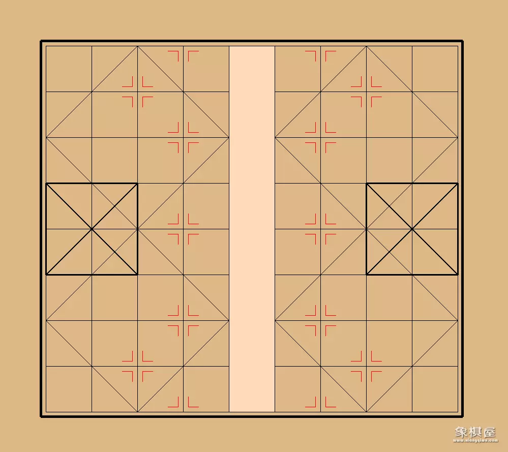 象棋是一种模拟古代战争的智力游戏,而棋盘就是红黑双方作战的战场。它共有九条直线和十条横线交叉组成。它像指挥员整天研究的地图,我们一定要认真地了解它,尤其是一些重要据点和要道。如图所示。 棋盘上左右方向的线为横线,共十条平行的横线,横线称为格,红黑双方均从各自的下方往上数,一格至十格。 棋盘上红方这边的直线,我们自右向左分别用汉字一至九来标示,相对应的黑方那边的直线,我们则自右向左分别用阿拉伯数字1至9来标示。