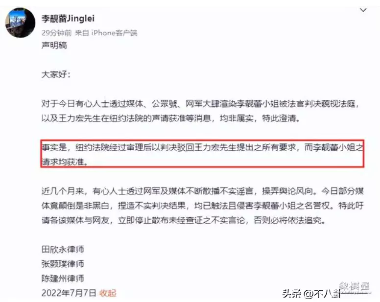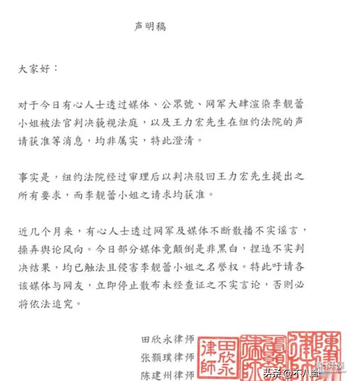 虽然粉丝们替王力宏在辩驳,可是找遍全网,也没发现能证明他胜诉的消息。反倒是之前李靓蕾与其三位律师团队,都称法院驳回了王力宏的请求,但李靓蕾的请求均获准。