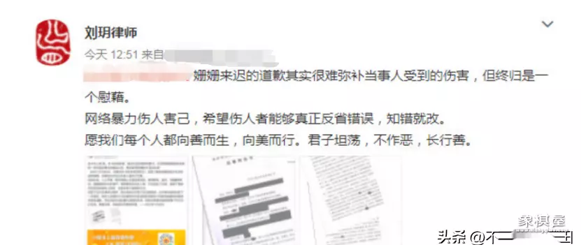之前他的代理律师就晒出过网友煽动发言的动态截图,称这是姗姗来迟的道歉,很难弥补当事人受到的伤害,但也算是一种慰藉,还说网络暴力伤人伤己。