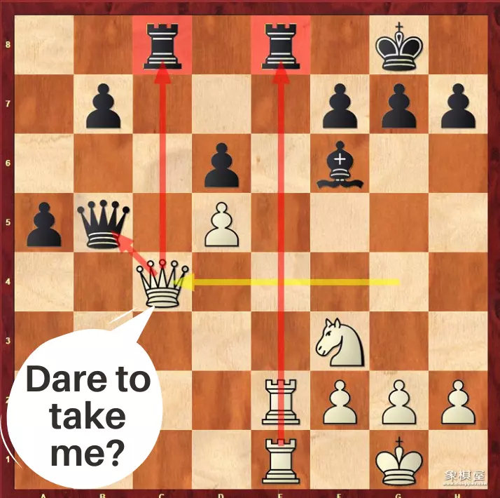 串击(skewer):攻击对方一个重要棋子时,如果它逃开,那么这条线上的一个次要棋子会被吃掉。
