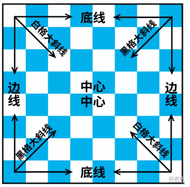 【斜线】棋盘上由同色小方格斜角相连而成的长短不一的各行称为斜线。