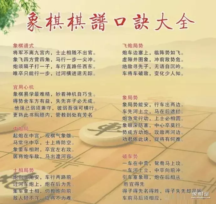 五:“象眼谨防塞”“马怕蹩脚”“车入险地”,“炮勿轻发”,“臭棋乱飞象”,“无事不支士”,“将忌暴露”。讲的是自乱阵营,棋招忌讳,弱点突出授人以隙,容易招到攻击,就像生活一样,时刻要保护好自己,不要跟自己过不去;