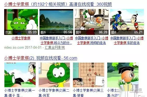 我马上就想:有没有这方面的动画片、app呢?于是到网上搜:儿童学象棋、趣味象棋、幼儿象棋,换几个关键词搜一搜。嘿!还真搜出来了呢!