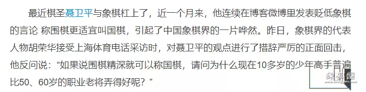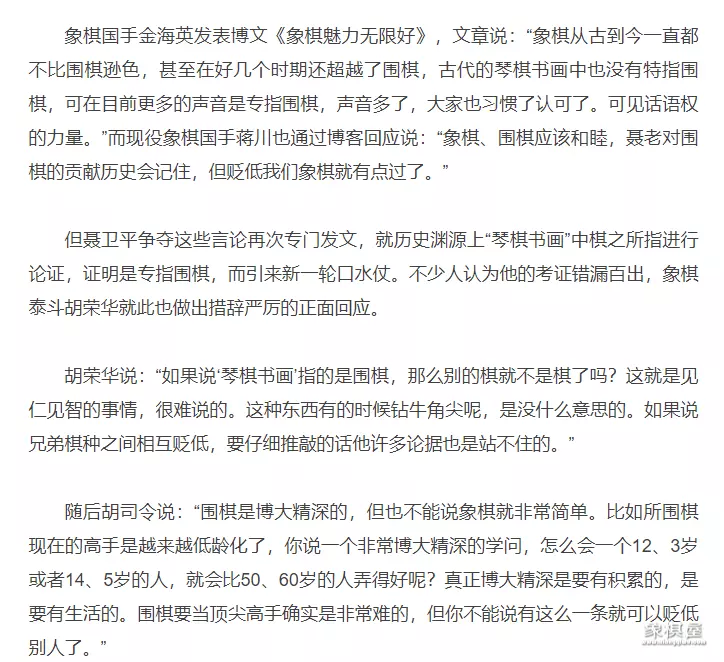 聂卫平当年在博客上的“围棋国棋论”,被象棋界群起而攻之。金海英、蒋川、党斐等象棋国手纷纷发文回应,而作为象棋界的代表人物,胡荣华也第一时间站出来严厉回击。