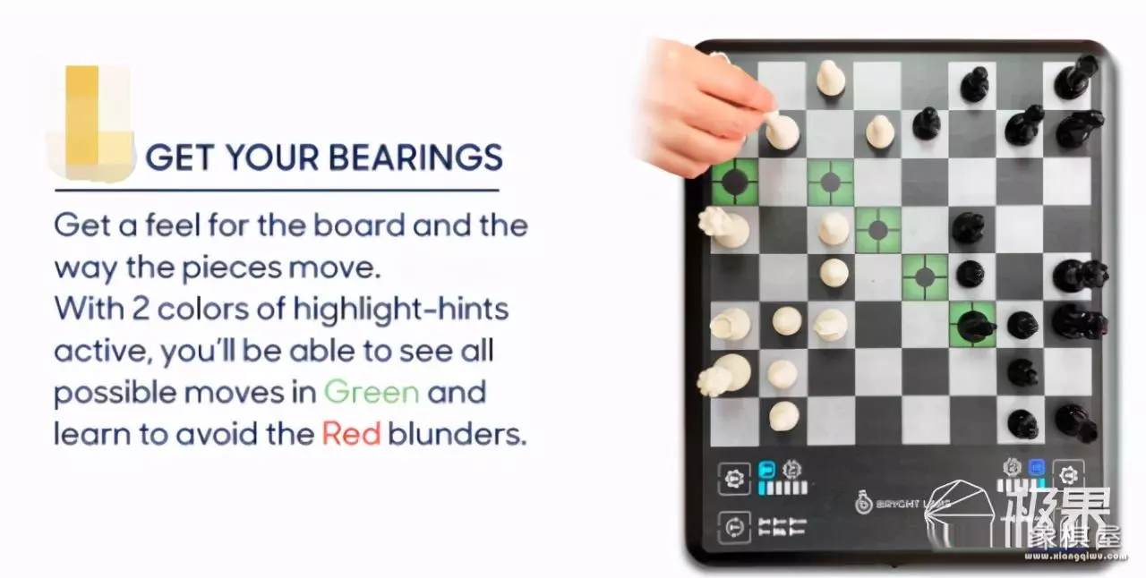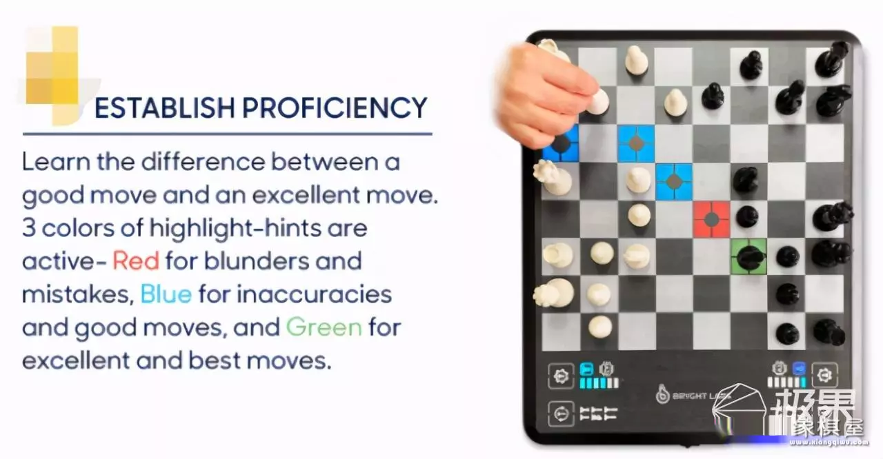然后你可以开始区分每一步行动位置的好坏,chessup会通过红蓝绿三种颜色的灯来分别表示差、良、优,从而慢慢提升自己。
