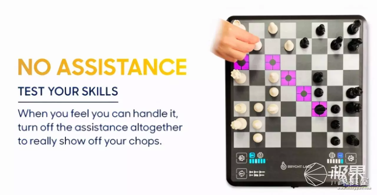 到最后就可以选择无提示模式,在你触摸一块棋子后,chessup只会亮起紫颜色的灯来告诉你能走哪,这样就起到了锻炼你真实技巧的作用。