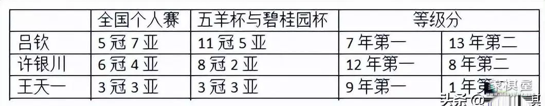 就现在总结来看 第一档,胡荣华,14冠。第二档,许银川,6冠。第三档,吕钦,5冠。第四档,李来群,赵国荣,杨官璘,4冠。王天一89年的,34岁,应该还有好几年巅峰期的..你认为呢?