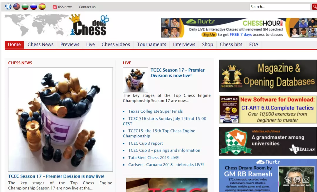 chessdom(国际象棋之家)与chessbomb(国际象棋直播网站)构成姊妹网站,主要特色两点: