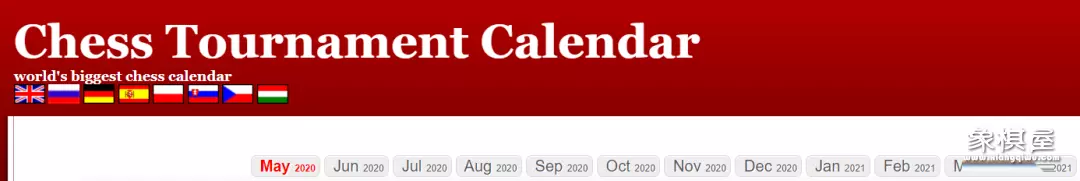 世界上最大的国际象棋锦标赛日历,汇总了全球一年内的国际象棋比赛信息,界面上以自然月划分时间选项,每条信息都简单明了的提供了比赛时间、地点、名称等信息,并注明信息来源。