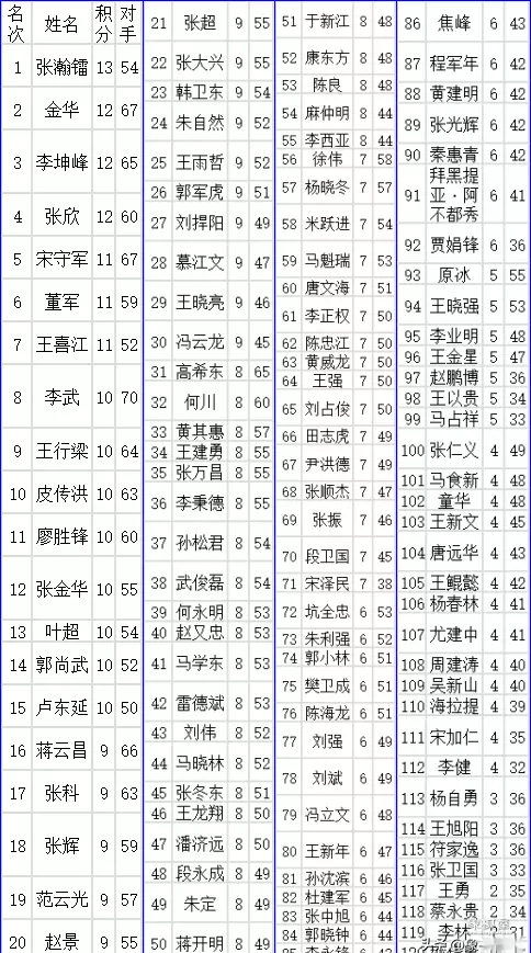 新疆名将,多次参加全国赛的金华六胜一负,12分取得亚军,李坤峰与张欣也是12分,两人小分略低,分居季军和殿军。