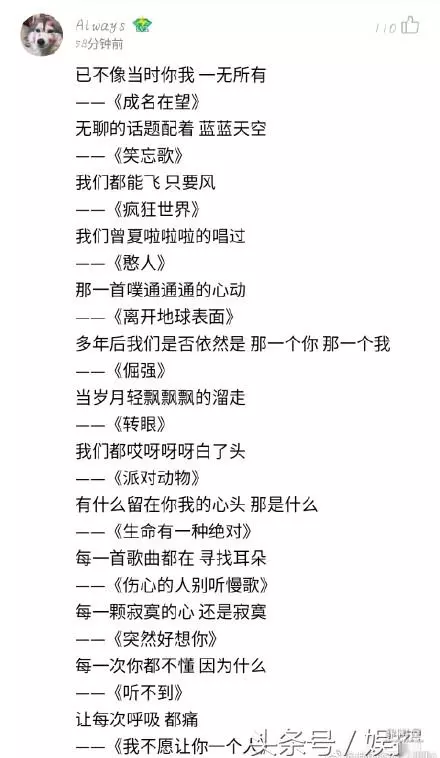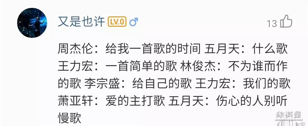 就说歌名吧,五月天的《什么歌》就被酷狗网友手动加入了周杰伦、王力宏、李宗盛、萧亚轩的队伍,与他们的歌名,整成一句“你问我答”的绕口令。