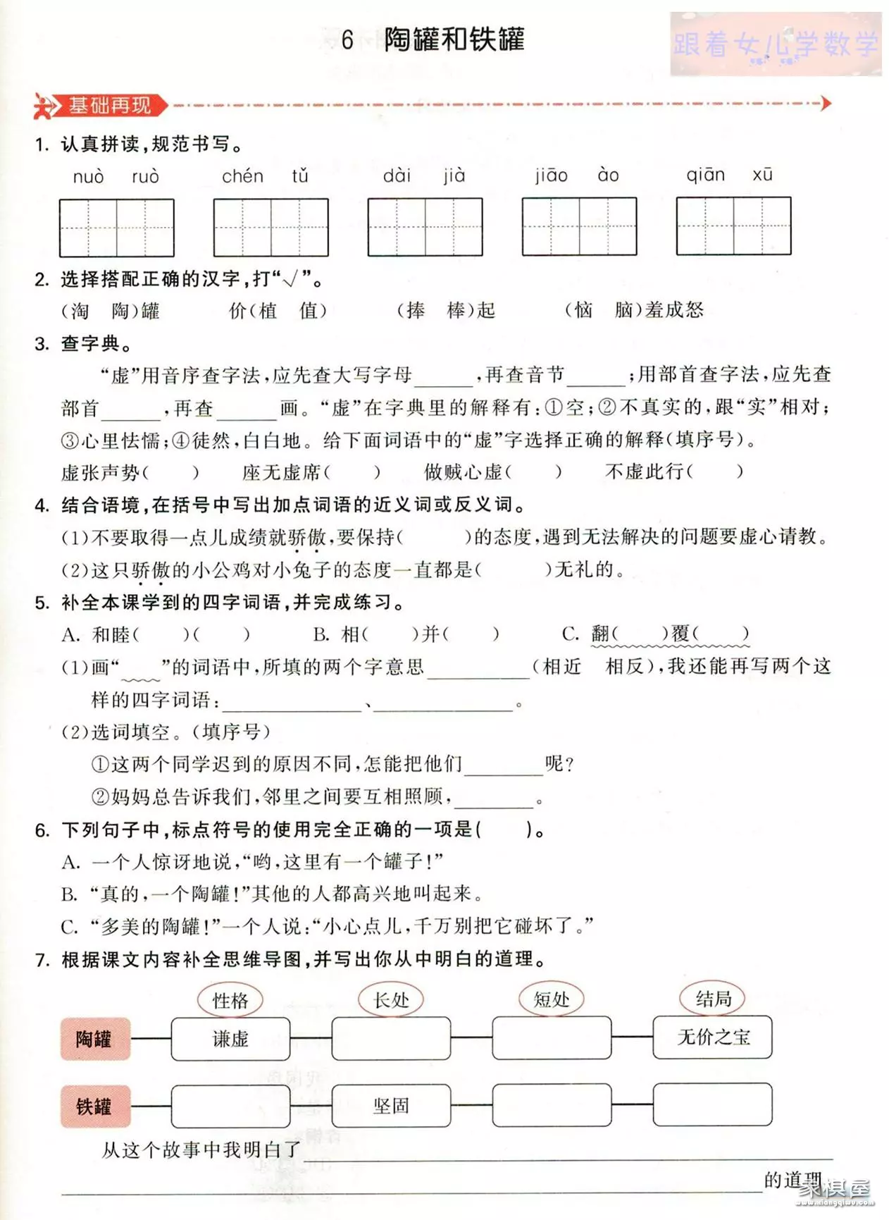 (2)本题考查对人物性格特点的把握。选文中,铁罐说话时表现出“傲慢、轻蔑、恼怒”的神情,而陶罐一直都表现得很“谦虚”。因此铁罐和陶罐的性格特点分别是傲慢、谦虚。