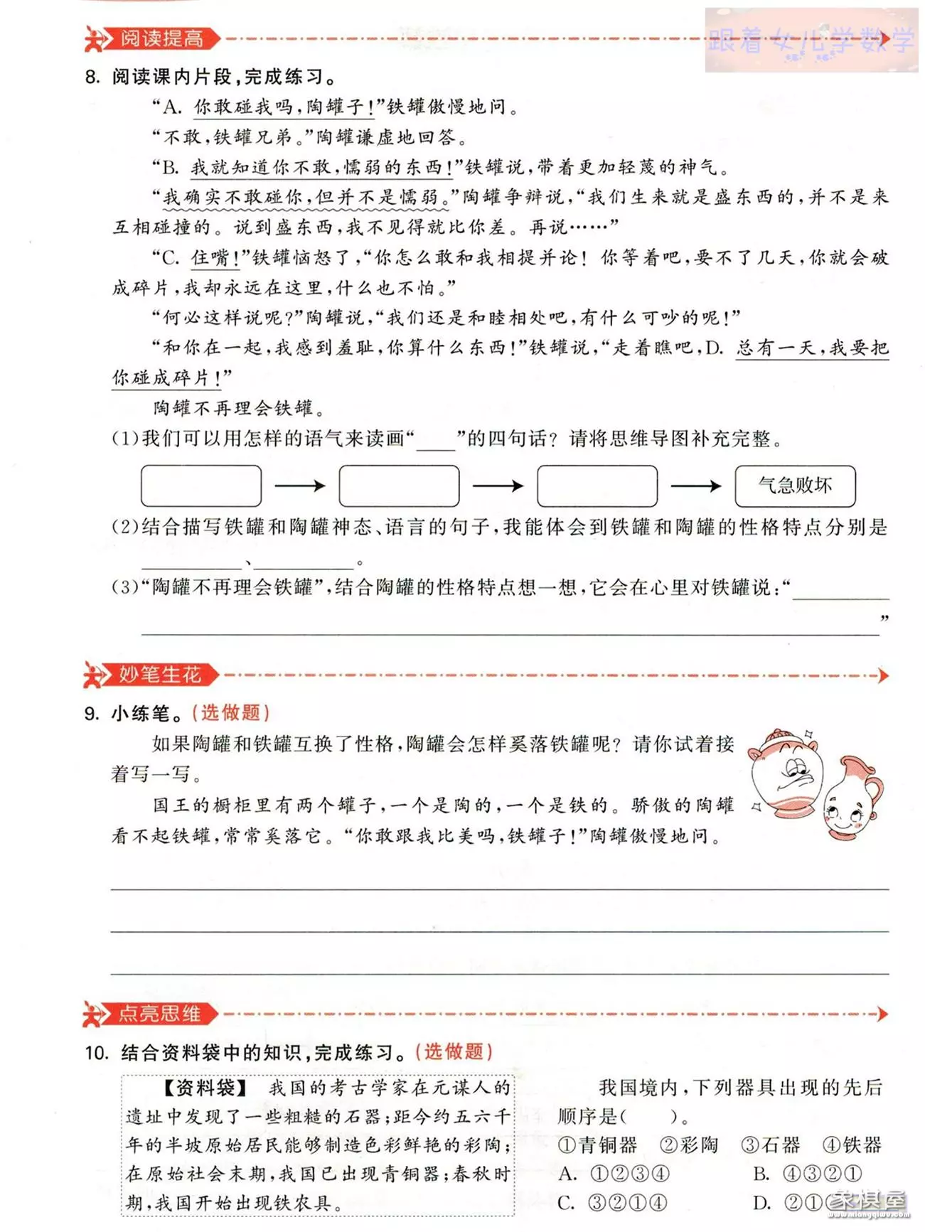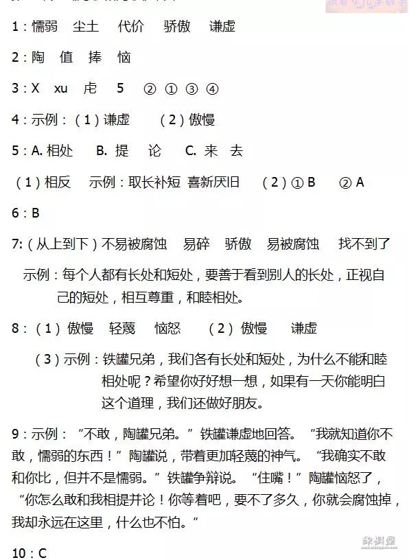 9. 本题考查想象和写作的能力。根据题目"互换性格”的要求可知,原文中铁罐奚落陶罐,抓住陶罐的短处来说,那么我们互换性格后,需要把陶罐的语言和神态改为骄傲的,把铁罐的语言和神态改为谦虚的。再根据不同的性格特点写一写即可。