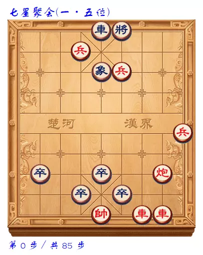 大型著名古局“七星聚会”的红方一路边兵有两种摆法:一种是红兵在一·四位,如《心武残编》、《蕉窗逸品》中的便是,另一种是红兵在一·五位,如《百局象棋谱》、《竹香斋象戏谱》、《渊深海阔象棋谱》中的便是,两种摆法在着法方面并无多大差异,只是前一种摆法的图势略为美观一点,着法也稍微复杂一点,民间棋局大都如此。
