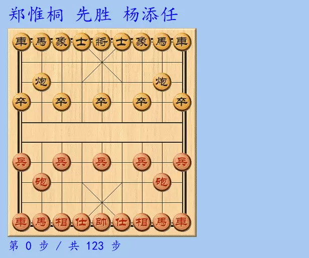 郑惟桐瞧准时机成熟,纵马奔槽,杨添任虽先弃一马挡住,再老将御驾亲征夺回子力,但阵型的凌乱,已是无可挽回。红方优势继续扩大,郑惟桐车炮合力,迫使黑棋再次弃大子,不过这一回,弃炮不能吃回,红车炮仕相全对车双卒双士,黑老将在三楼宫顶,一卒在过河低位,一卒没过河,无力续战,123手杨添任认负,郑惟桐同获两连胜。