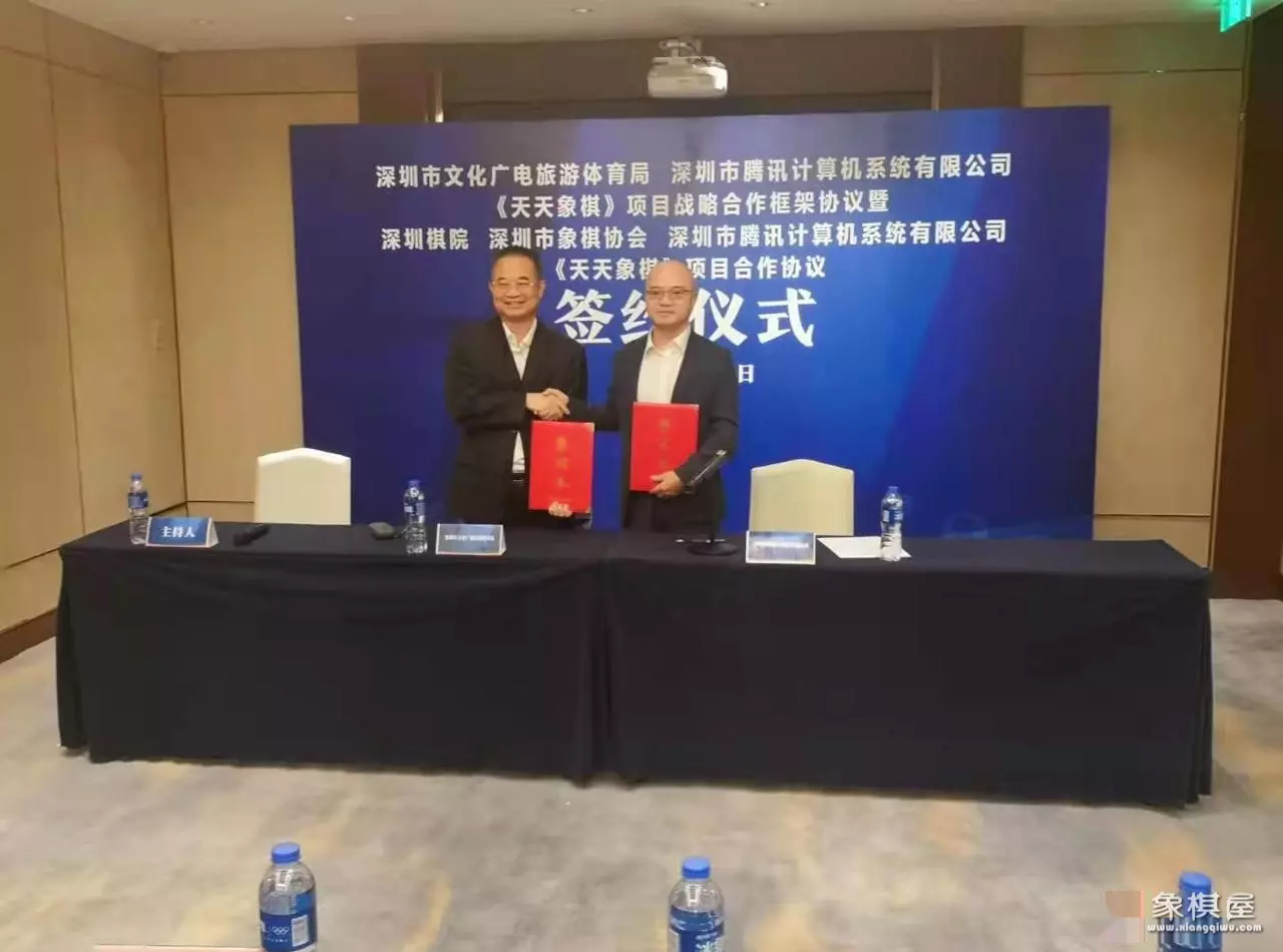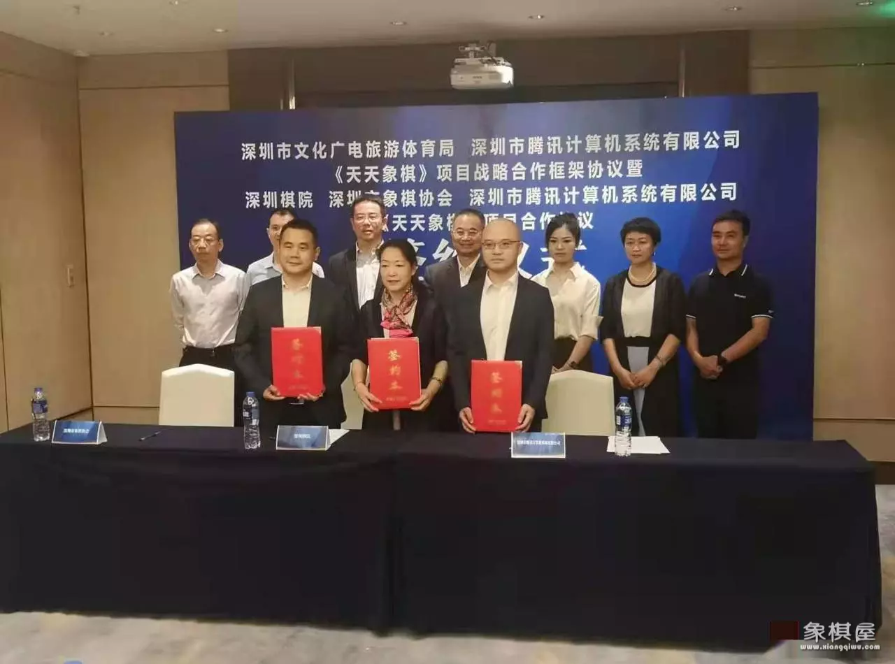 5月8日上午,深圳市文化广电旅游体育局和深圳市腾讯计算机有限公司关于《天天象棋》项目签约仪式在罗湖举行,双方签订框架协议。深圳棋院、深圳象棋协会与腾讯光子-天玑智趣工作室签订三方执行协议,将在会员认证、线上考级系统、智能赛事系统开发、线上赛事技术服务支持、象棋校园教育深度合作等方面开展深入合作。深圳市文化广电旅游体育局副巡视员王志强、群众体育处处长王继,腾讯光子-天玑智趣工作室总经理范勇,深圳棋院院长刘适兰,深圳市象棋协会会长曹阳,深圳棋院副院长张进、工会主席黄勇,腾讯互娱光子市场总监徐玥,