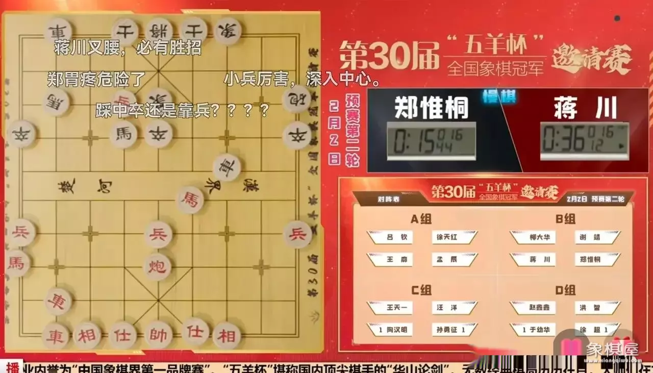 第30届五羊杯象棋赛第二轮比赛,红方蒋川对阵黑方郑惟桐,这盘棋蒋川的一世英名“毁于一旦”,残棋水平受到诟病。