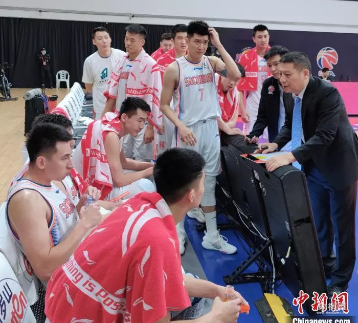 末节比赛,双方比分胶着,在关键球的处理上四川男篮主教练进行及时布置。 四川男篮供图