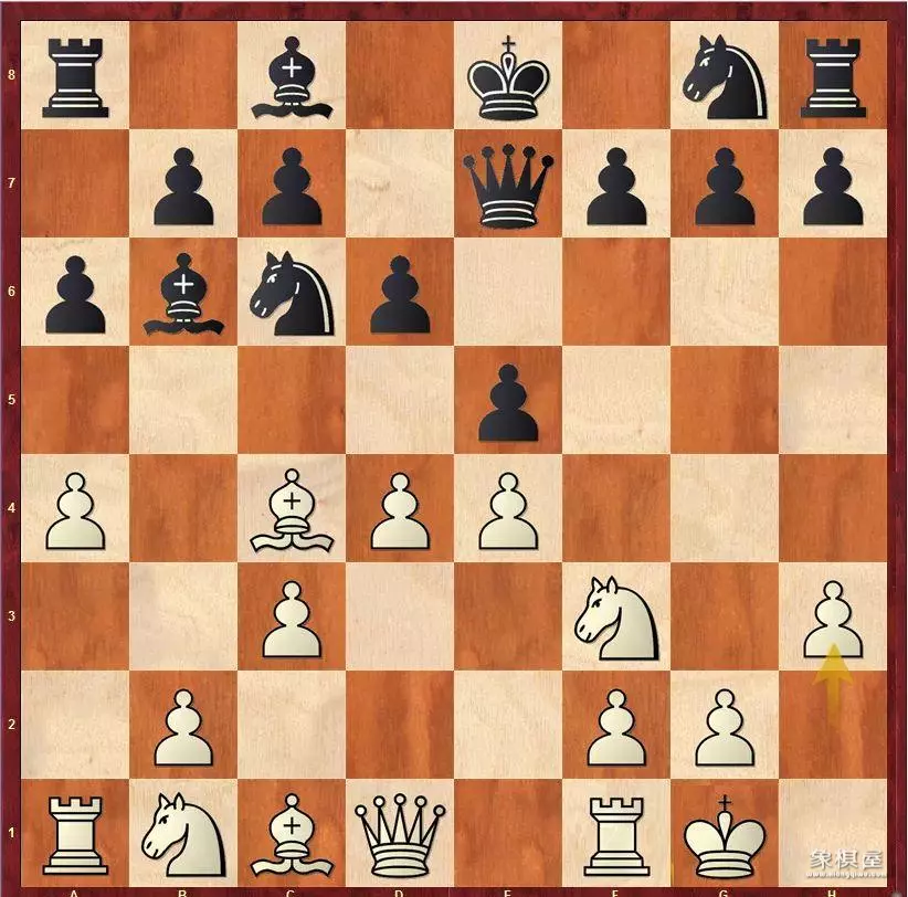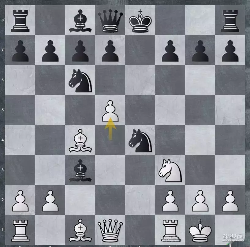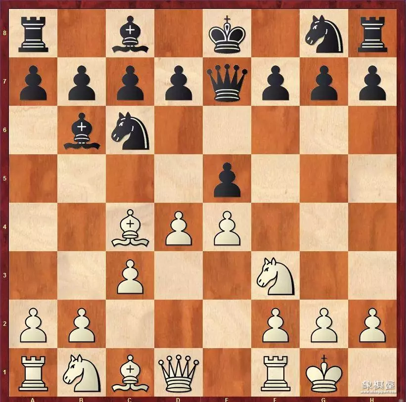 由此展开最有趣、最激烈的变化。白方准备再挺兵d4,控制中心,而黑方想挫败这一计划,有两种选择,攻击e4兵或者加强e5兵,两种选择又变出三种走法: