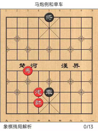 马炮守和单车,必须炮在帅前或帅后相护。若炮在帅门前,守和方法为:马与炮相互呼应,不要远离帅门。若炮在帅后,守和方法为:马与炮相照应,切忌马与帅一线,因黑有将平帅门牵制的手段,马炮则无法守和。