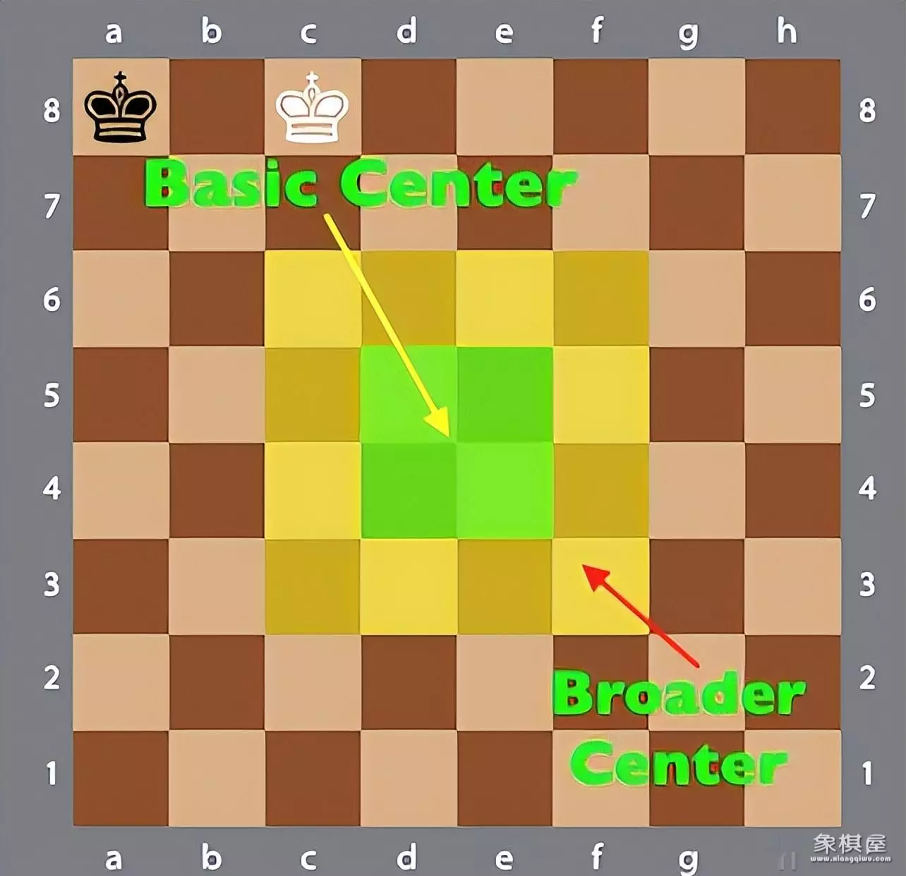 棋盘上由c3-c6-f6-f3格围成的正方形(广义的中心 broader center,16个方格),e4,d4,e5和d5是中心的最重要的部分(狭义的中心 basic center,4个方格),e线和d线是中心竖线。