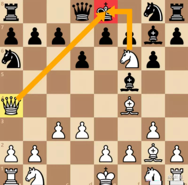 闪击(discovered attack):事先埋伏好棋子,一旦前方棋子突然闪出一条路,躲在其后的棋子就会出其不意的发动攻击。