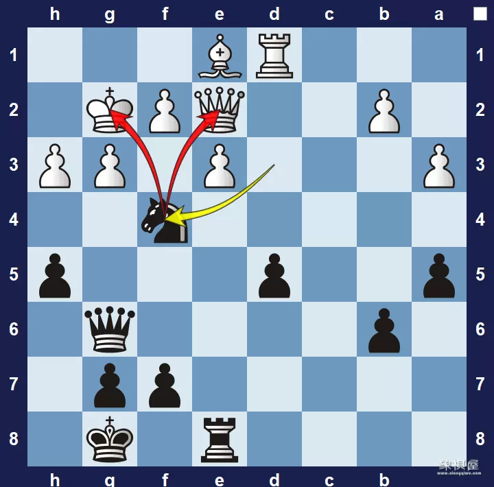 捉双(fork):一个棋子同时攻击对方两个或两个以上的棋子,被称为捉双。攻击王和后的捉双叫做皇家捉双(royal fork)。