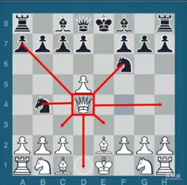 后是国际象棋中威力最大的棋子,从立体棋子的造型上看,后比除王以外的任何棋子都要高。后的走法结合了车和象的走法,他能唱任何方向沿着他所在格的横线竖线斜线走棋,格数不受限制,但是不能在中途改变方向,也不能越过挡路的棋子。后不能越过棋子,如果阻挡的棋子是对方的,那么后可以吃掉它。如上图所示,黑后可以吃掉白象或者白兵,但是不能吃掉白马,因为白马被白兵挡住,所以白马是安全的。