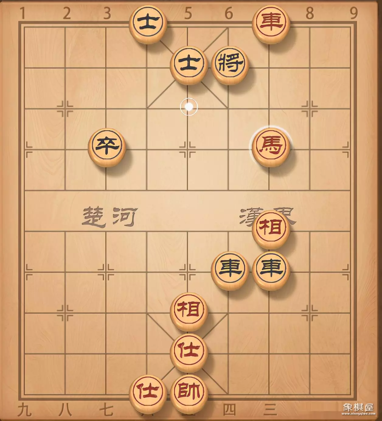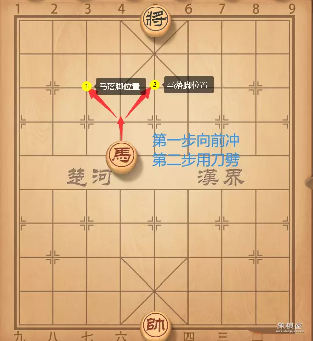 又叫"士角马",指的是一方的马在对方九宫的两个士上角中的任意一个对还没有移动位置的将(帅)形成叫将的局面。如图所示,黑方将5平4,红方车五平六绝杀。