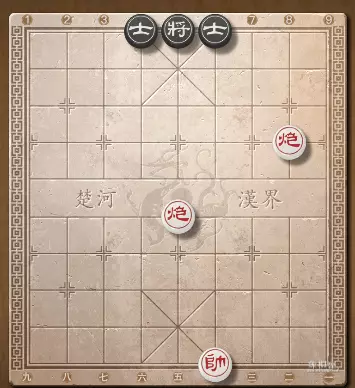 如图所示,红兵及黑双士已经限制住了黑将的移动空间,且红方双炮已经在中路蓄势待发,只要在中路打开局面,便可取得胜利。想要在中路打开局面,炮击中卒便是很容易想到的棋。