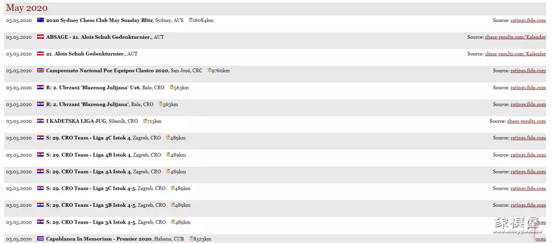 世界上最大的国际象棋锦标赛日历,汇总了全球一年内的国际象棋比赛信息,界面上以自然月划分时间选项,每条信息都简单明了的提供了比赛时间、地点、名称等信息,并注明信息来源。