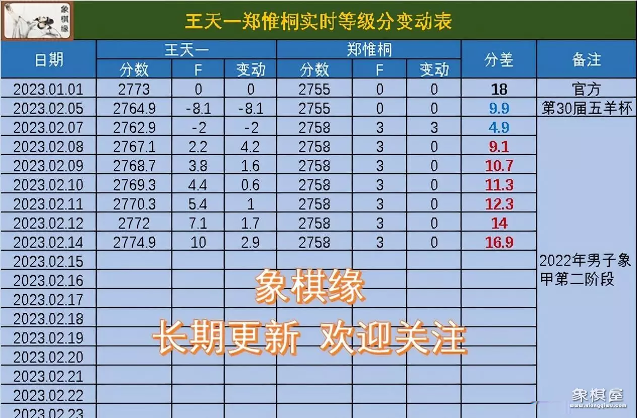 王郑实时等级分:王天一2774.9,郑惟桐2758,分差16.9。