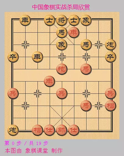 担雪填井着法:红先胜1.炮七进二! ……如改走车三进一,则车9平7,炮七进二,象1退3,马八进七,将5平6,马一进三,车7进2,炮五平四杀!1. ……象1退3。首着弃炮填将,是取胜的钥匙,以下自明。2.车三进一!车9平7。3.马八进七,将5平6。4.马一进三……此着如“担雪填井”的第二“筐”,取胜要着。