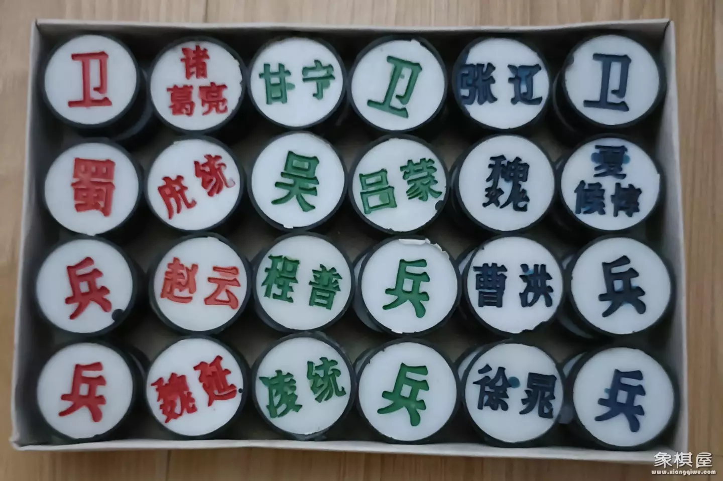 还有一副三国大战棋,即“三国象棋”。三军的主帅分别为: 【魏】曹,【蜀】刘,【吴】孙。他们的相分别是: 司马懿,徐庶; 诸葛亮,庞统;周瑜,鲁肃。他们的車马炮分别用的是 张郃,许褚;关羽,马超;甘宁,黄盖。