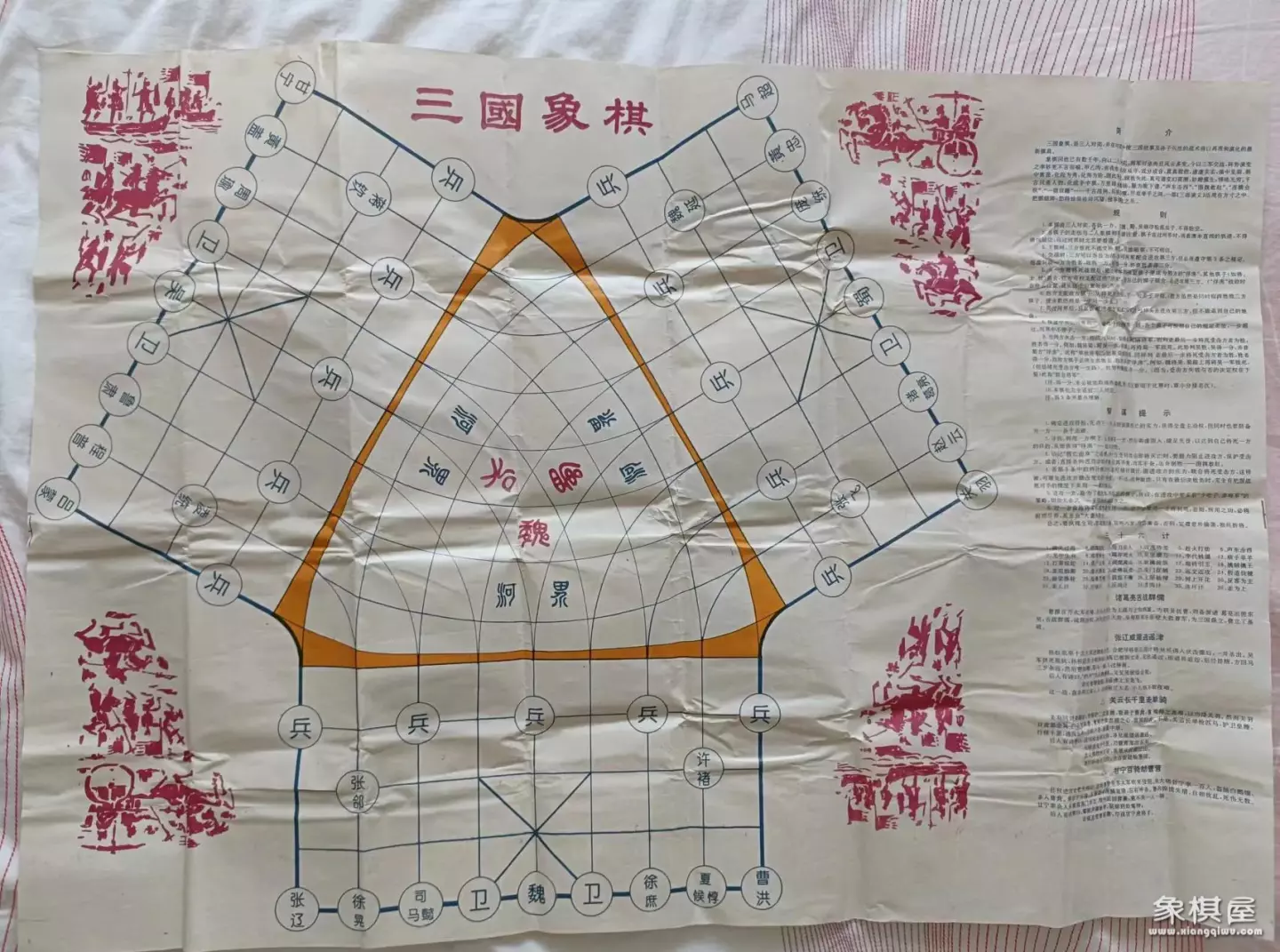 此棋由三人对奕,各执一方,按魏,蜀,吴顺序轮流出子,不得轮空。