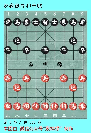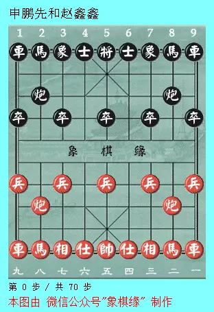 第一局,申鹏执红先行。中炮弃三兵对屏风马。双方落子如飞,都显得对这一布局非常自信。特别是赵鑫鑫,几乎不用思考,随风而动,挥洒自如,给申鹏施加了一定压力。其实这一局只是一道开胃菜,双方输攻墨守,进行了一番试探性地攻击后,罢兵言和。
