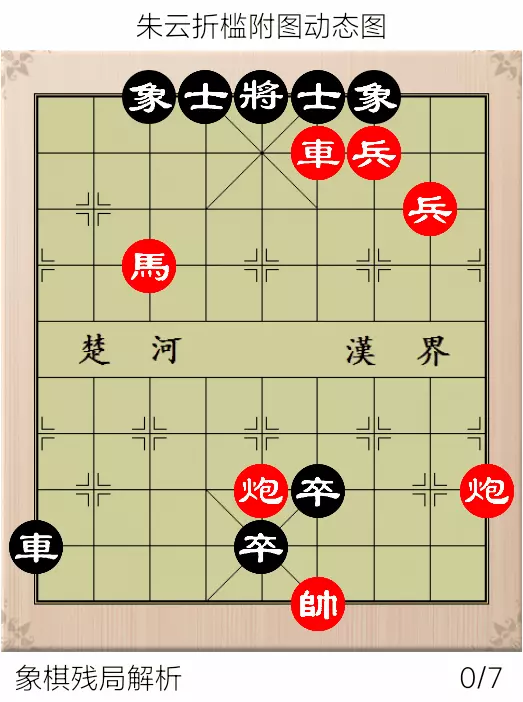朱云,字游。汉代山东人。元帝时,任槐里县令,耿直,数许权贵,以至被害判刑。成帝时,他又写上诉书说,愿借尚方宝剑,斩佞臣张禹。成帝大怒,让拉出去杀头,御史去拉朱云,而朱云用力攀折殿槛。由于辛庆忌出面相救,得免一死。后来要修复折损的殿槛,成帝令不修复,用以表彰直言敢谏的人。后人就以“朱云折槛”来赞扬直言敢谏的人。(见《汉书》)元代诗人乃贤《金台集》有诗赞道:“谏垣屡赏朱云节,宣室重陈贾谊辞。”此局棋,红方弃车毁士,犹如“朱云折槛”,故名。