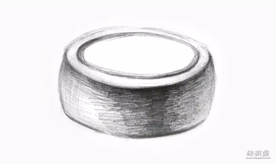 圆形的棋子,看上去就好像是一个“压缩”的圆柱体。圆柱体我们在学习素描的石膏几何体中接触过,它是素描基础必学的一个几何体。事实上,任何物体都可以用几何来概括。比如象棋的棋子,它在造型上就是一个简单的圆柱体;在光影上,它有亮调子、灰调子、明暗交界线、反光和投影。处理好黑、白、灰的关系,我们才能描绘出立体感十足的棋子。