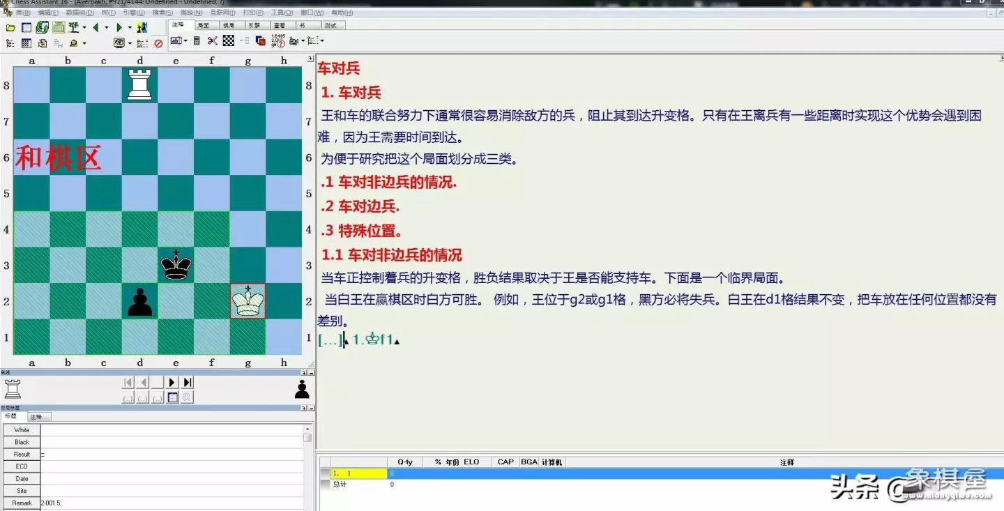 3 策略类,残局策略应该属于方法论的范畴,主要探索不确定的残局局面对弈指导思想。较早的残局策略书是 shereshevsky的《残局策略》,该书精选了132个实战局面,首次深入揭露了残局对弈的指导思想,比如王的中心化,别着急等等系列原则,为残局策略奠定了基调,自1981年出版以来广受好评。不过学术界总是后来居上,muller karsten的《how to play chess endgames——a comprehensive guide to endgame strategy》才是此类书的集大成者。光参考的书目就有60多本。基本上2008年之前的残局名著全参考了,而且动用了残局库校对,这种情况非常少见,也见证了德国学者的严谨。