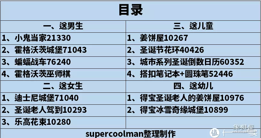 马上就要到圣诞节了,你是否在发愁送什么礼物呢?在我看来,乐高玩具是不错的选择,因为乐高套装极其丰富,不论是男生、女生,还是儿童、幼儿,都能找到适合自己的那一款。今天,我就针对不同人群喜好,推荐几款非常值得作为圣诞礼品的乐高套装,希望对准备入手的朋友有所参考!下面正式开始!