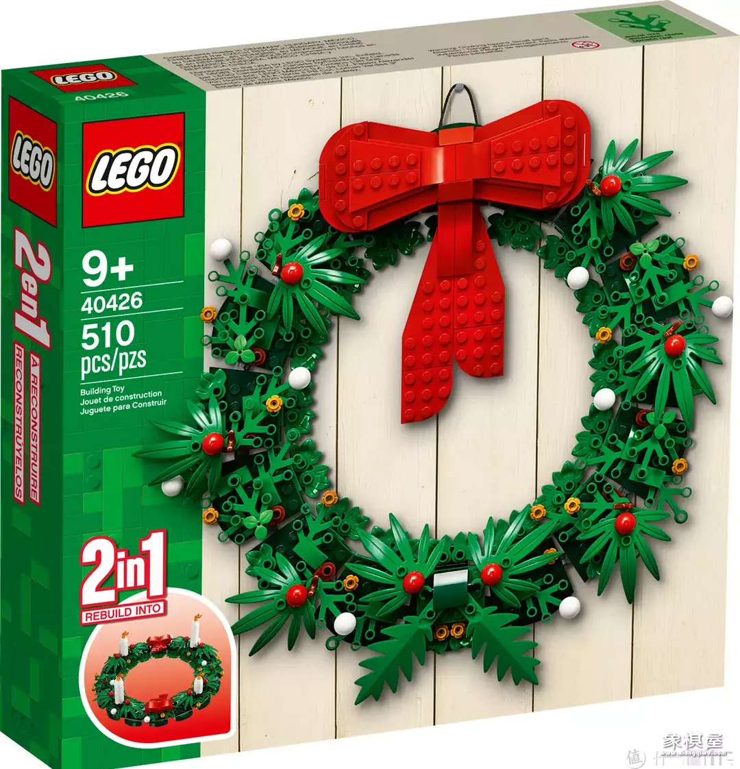 特点:使用花环装饰门口是圣诞节的传统,以往都是用圣诞树枝叶、冬青果实、红色丝带搭配编制成花环,40426通过乐高颗粒制作出圣诞节花环,整体效果很不错,挂在自家门上,特别有氛围感,而且可以连续多年使用、不担心枯萎的情况。另外,它还支持平放形态,插上四支蜡烛,可以当做儿童生日装饰物。